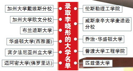 近日,李晓彤收到了11所美国大学本科的录取通知书,其中包括华盛顿大学在内的8所美国大学在美国排前50名。这11所美国大学中,他在乔治华盛顿大学获得了学校的半年奖学金,其他均需自费。