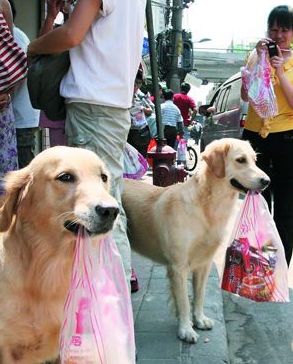 买了东西,有狗狗来帮忙提,电话来了,狗狗还能把手机交到主人手上,钱放在身上不放心,有狗狗代为保管。广东的吴阿姨说起自己的两条聪明“乖女”狗就眉飞色舞,金毛犬Lila和Yama生得十分乖巧可爱,不仅抢着当“妈咪”的“搬运工”,还成了众街坊眼里的“明星女”。