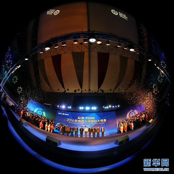 1月5日,2016年中式八球国际大师赛在河北省秦皇岛市奥体中心体育馆开赛。此赛事为期6天,共有来自中国、英国、美国等25个国家和地区的64名选手参赛。图为开幕式现场(2016年1月5日摄)。新华社记者杨世尧摄