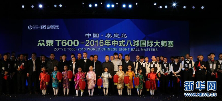 1月5日,参赛选手与嘉宾在开幕式上合影。当日,2016年中式八球国际大师赛在河北省秦皇岛市奥体中心体育馆开赛。此赛事为期6天,共有来自中国、英国、美国等25个国家和地区的64名选手参赛。新华社记者杨世尧摄