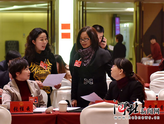 1月10日,分组审议已经结束,沧州团的张桂云、卢明、何玲、董青香(从左到右)4名代表间的讨论并没有结束,她们就共同关注的科技创新、行政审批改革、研究客户适应市场需求等话题进行了深入交流。河北日报记者 摄