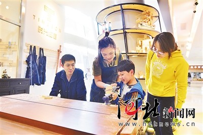 4月17日,省会一家三口正在老师的指导下体验做木工,享受亲子时间。记者 陈腾飞摄