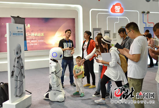 5月19日,廊坊国际会展中心中信国安“中国互联网之城”展区,参观者与智能机器人亲密接触。中信国安集团在我省香河启动“中国互联网之城”项目,利用先进的信息技术开启“互联网+智慧城市”新模式,让城市更美好、更智慧。河北日报记者赵 威摄