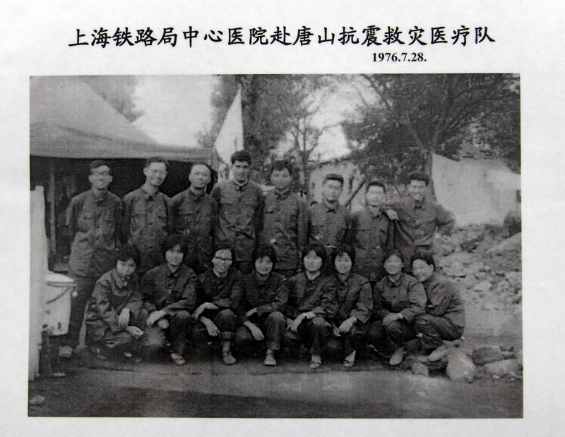 当年赴唐山的上海铁路局中心医院医疗队的队员们在废墟旁集体合影(7月21日翻拍)。