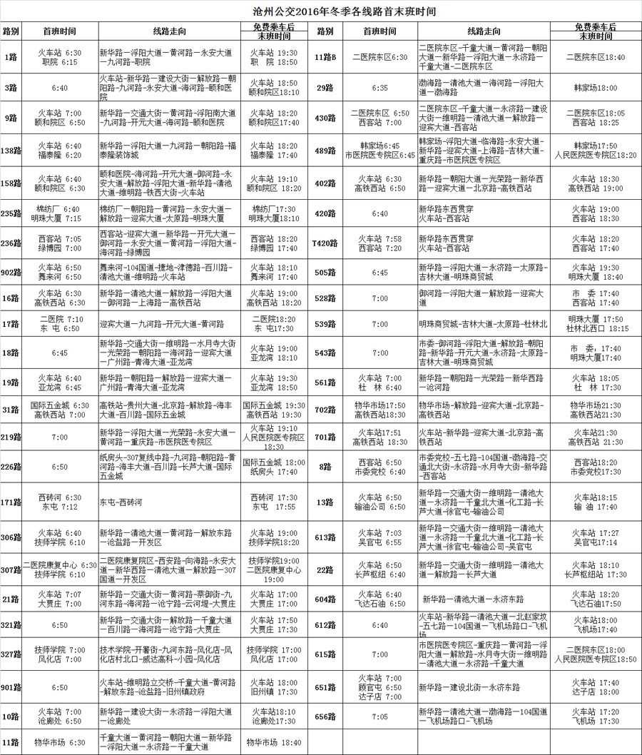 为保障市民便捷出行,16日起,沧州公交1路、11路、19路、505路等主要线路末班时间将延时。详细线网运营情况见下表。
