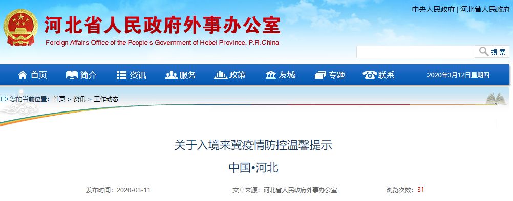 近日,省政府外事办公室发布关于入境来冀疫情防控温馨提示↓↓