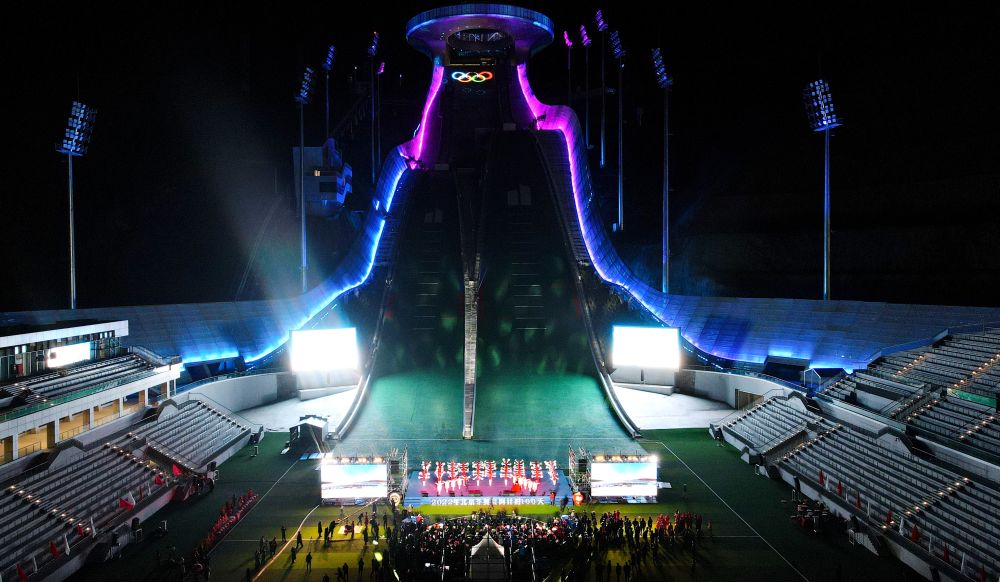 10月26日在张家口市崇礼区国家跳台滑雪中心“雪如意”举行的北京2022年冬奥会倒计时100天庆祝活动(无人机照片)。新华每日电讯记者金皓原摄