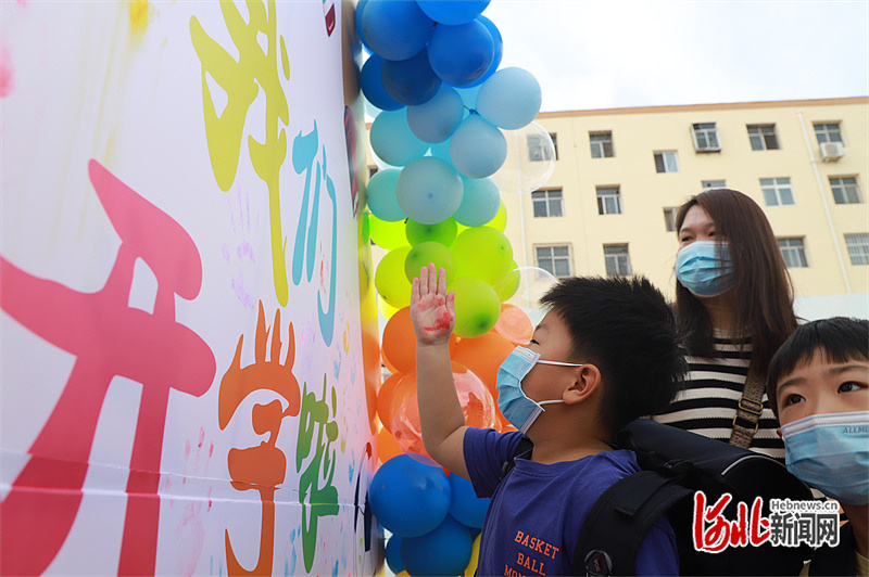 在“我们开学啦”背景墙上,珍宝街小学一年级新生留下手印。河北日报记者焦磊摄