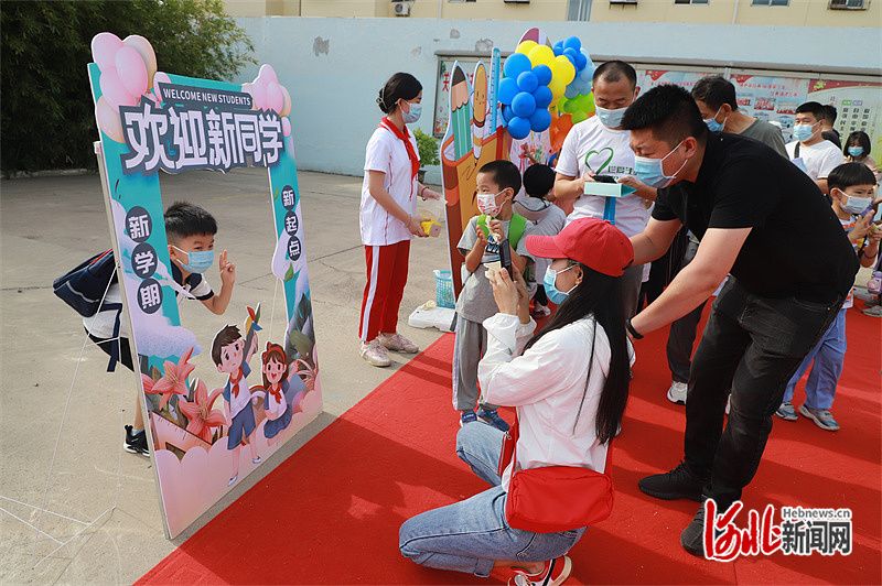 在卡通相框前,家长给孩子拍下宝贵的入学记忆。河北日报记者焦磊摄
