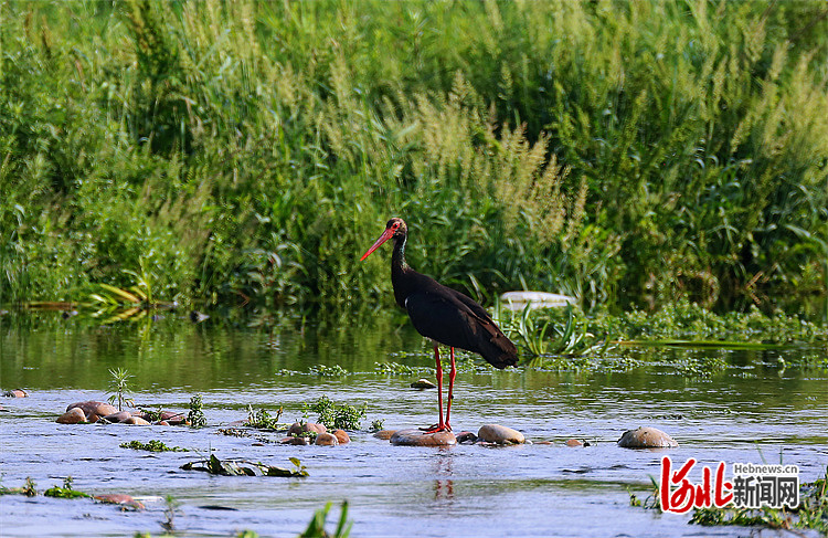 涉县清漳河国家湿地公园里栖息捕食的黑鹳。通讯员路海东摄