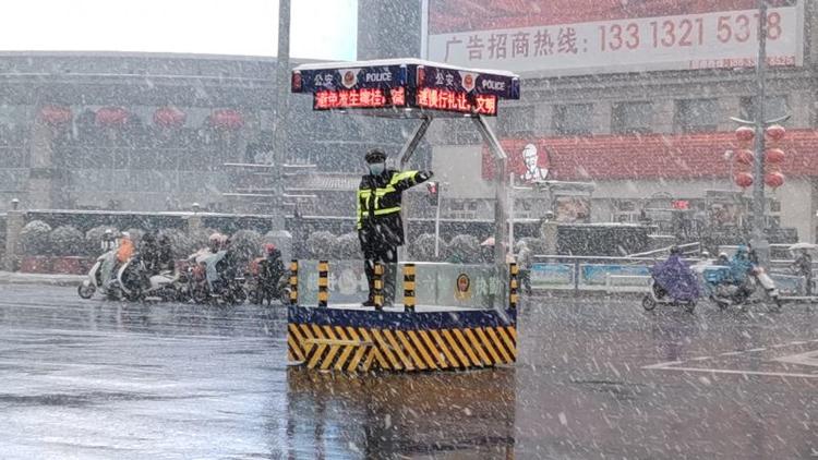 图为邢台交警雪中指挥。河北省交管局供图