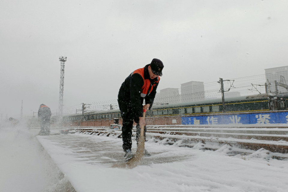 图为石家庄站工作人员正在清理站台、道岔等重点处所积雪。河北日报通讯员曹周旋摄