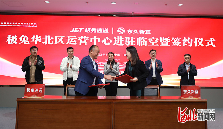 4月23日,极兔华北区运营中心进驻临空暨签约仪式在廊坊临空经济区国际现代商贸物流CBD举行。通讯员李良摄