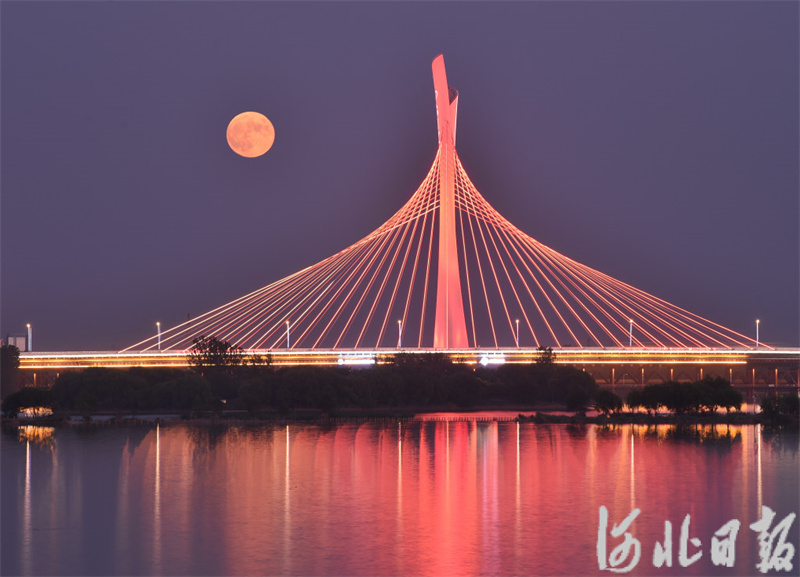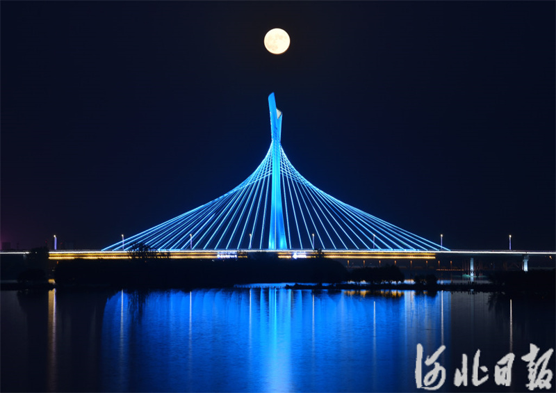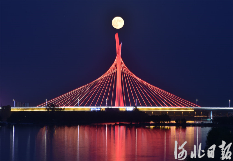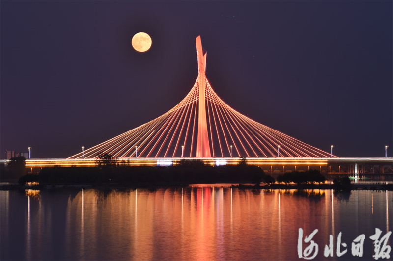 9月29日晚,石家庄市复兴大街滹沱河特大桥在中秋圆月的映衬下美轮美奂。