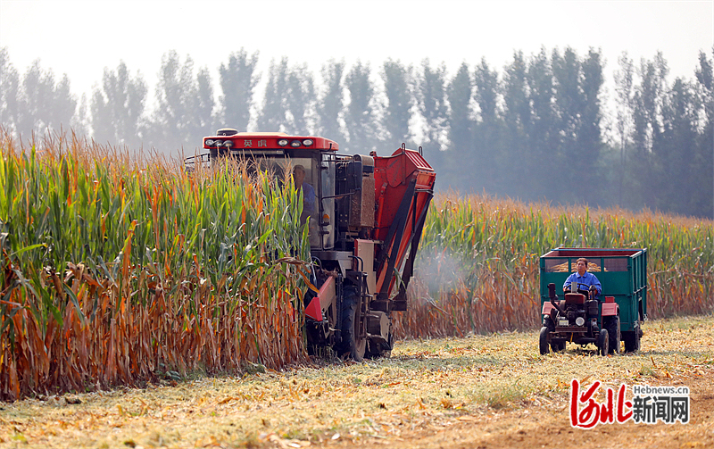 10月8日,在衡水市桃城区郑家河沿镇焦高村,玉米联合收割机正在进行秋收作业。河北日报通讯员 张 凯摄