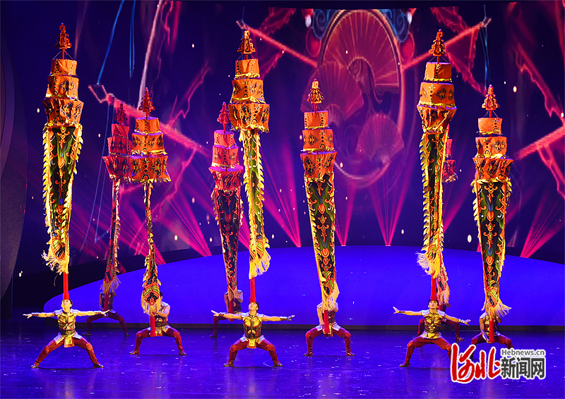 10月24日,第十九届中国吴桥国际杂技艺术节A场比赛在河北省艺术中心举行。图为《龙跃神州——中幡》节目。河北日报记者 史晟全摄