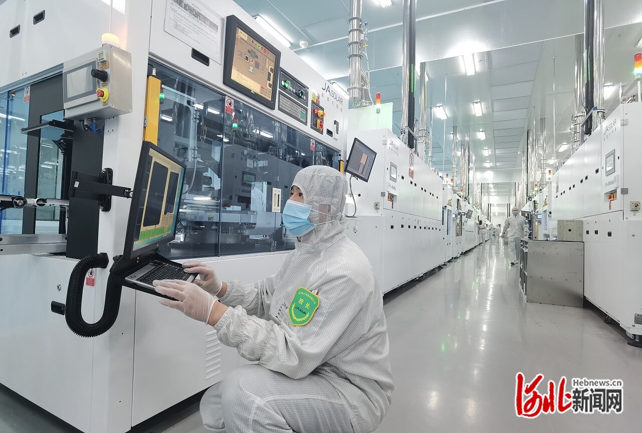 3月21日,在石家庄晶澳太阳能科技有限公司生产车间,工作人员正检测产线运行情况。河北日报记者 王育民摄