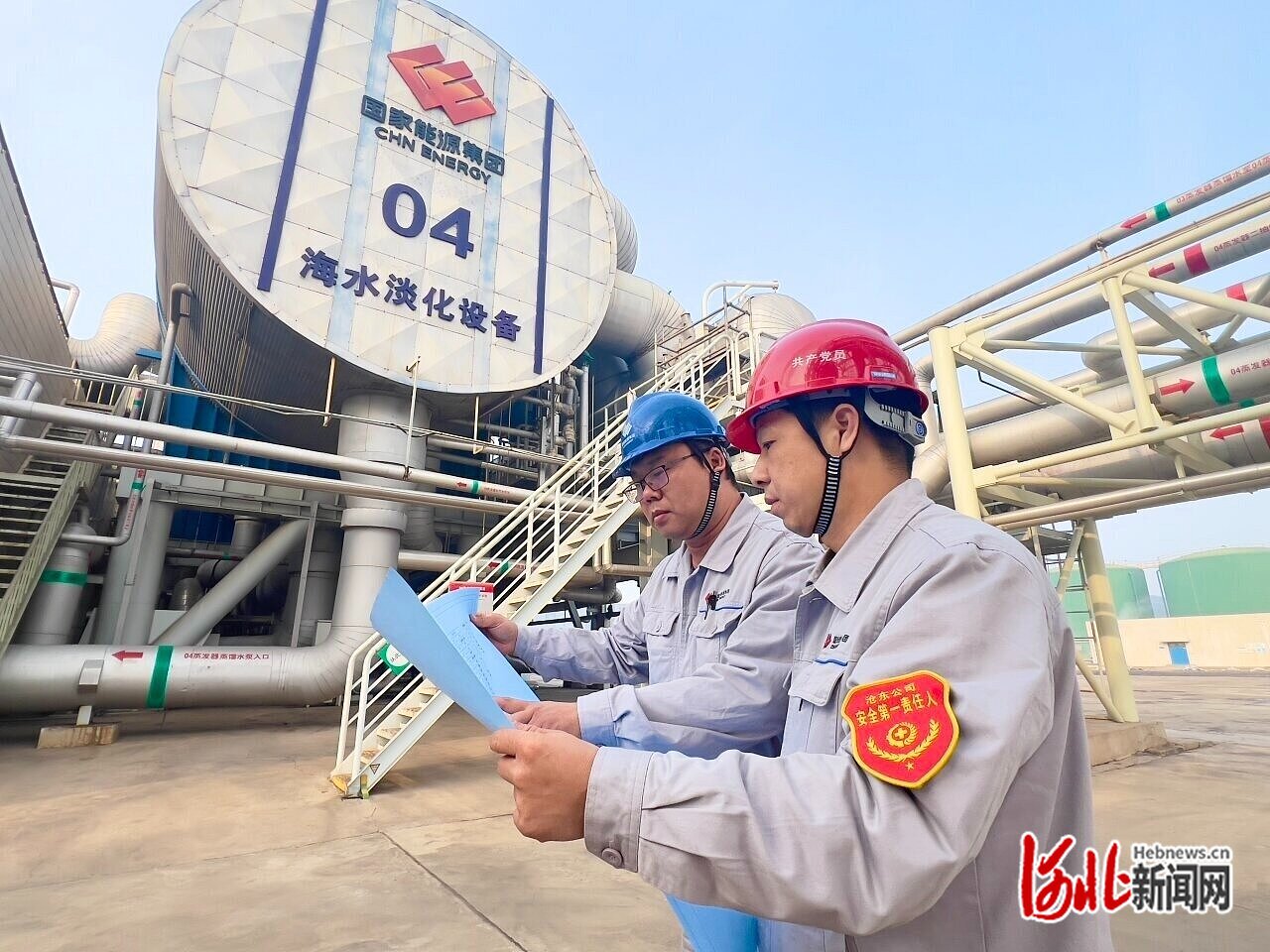 4月24日,国家能源集团河北公司沧东电厂的巡检人员在对海水淡化设备进行例行检查。河北日报记者 袁铮摄